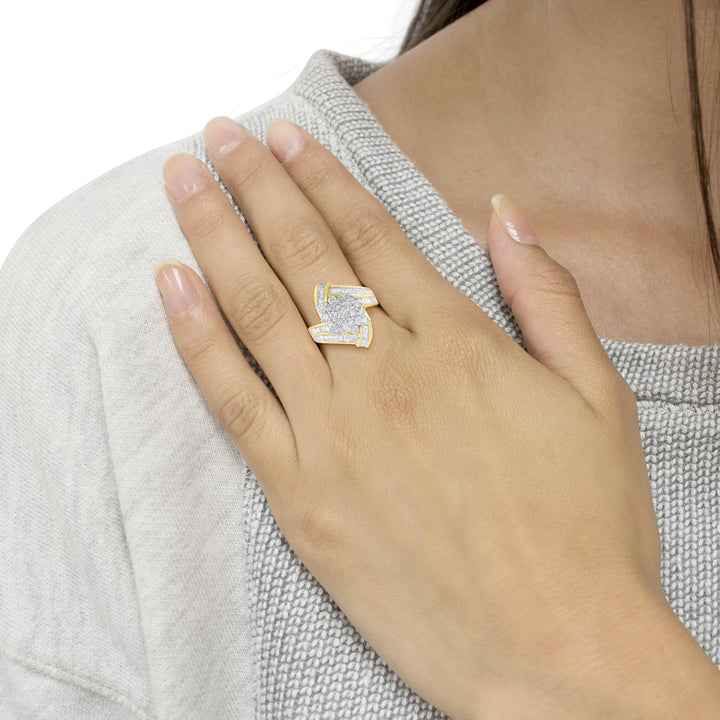 10K Yellow Gold Round and Baguette Diamond Crossover Cluster Ring (3 Cttw, I-J Color, I1-I2 Clarity)