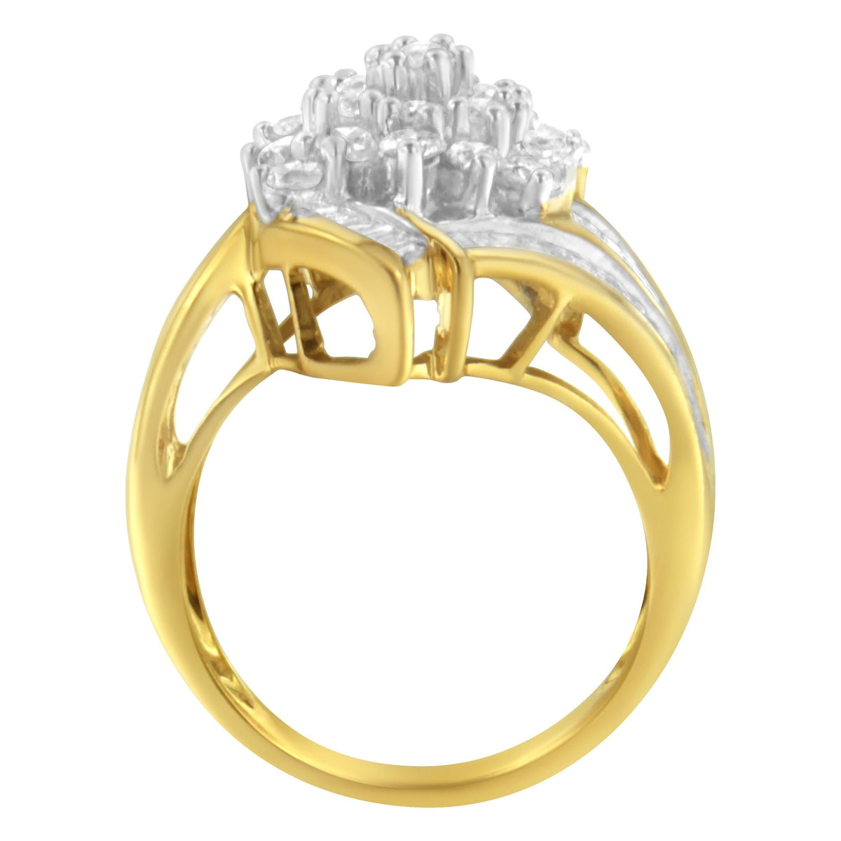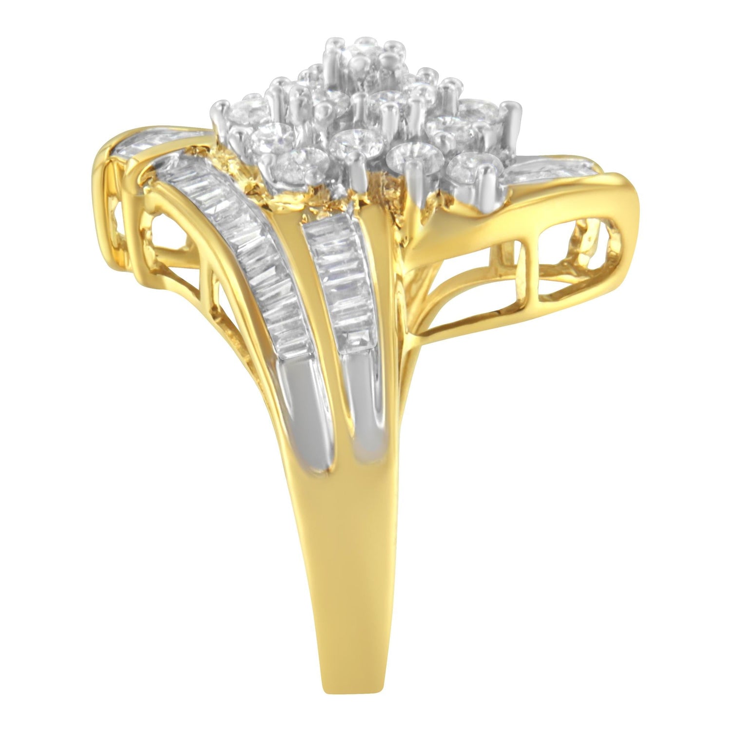 10K Yellow Gold Round and Baguette Diamond Swirl Ring (2.0 Cttw, J-K Color, I2 Clarity)