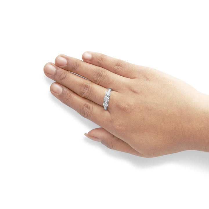 This 14K White Gold 1.0 Cttw Round Lab Grown Diamond 3 Stone Ring by Haus of Brilliance is a stunning representation of everlasting love. The 1.0 carat total weight of three lab-grown diamonds are set in a classic 4-prong setting, each diamond shining with F-G color and VS1-VS2 clarity. Crafted in 14K white gold and rhodium-plated for extra shine, this ring symbolizes a bright future, making it the perfect choice for engagement or a meaningful milestone.