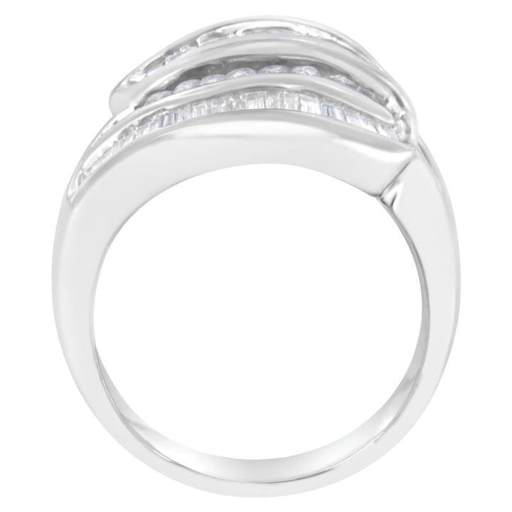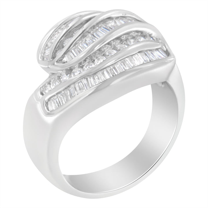 This 14KT White Gold Diamond Bypass Band Ring by Haus of Brilliance is a one-of-a-kind piece featuring five rows of alternating round and baguette-cut diamonds. Crafted in 14K white gold, this stunning ring has a total diamond weight of 1 carat and is perfect for any occasion.