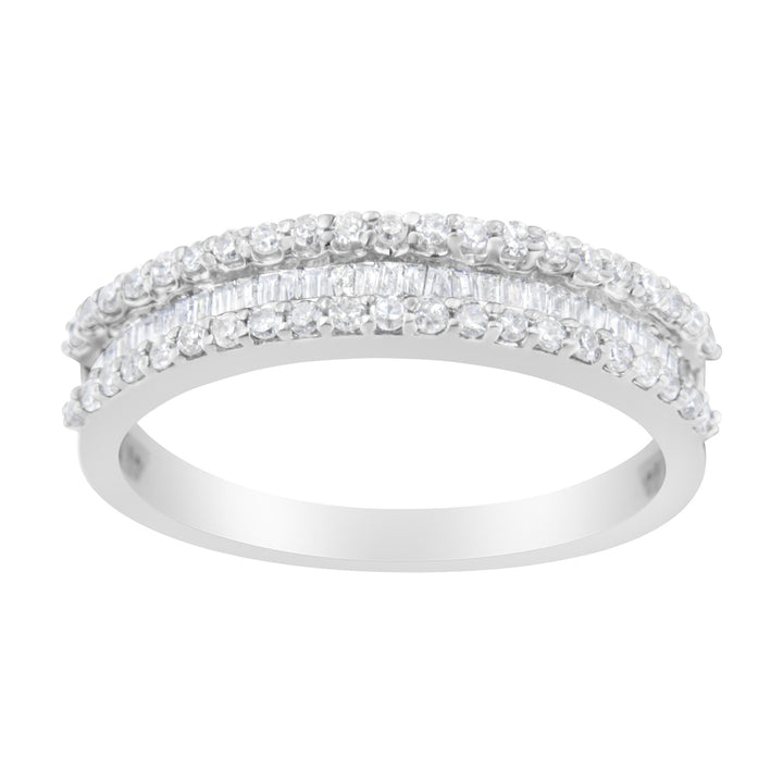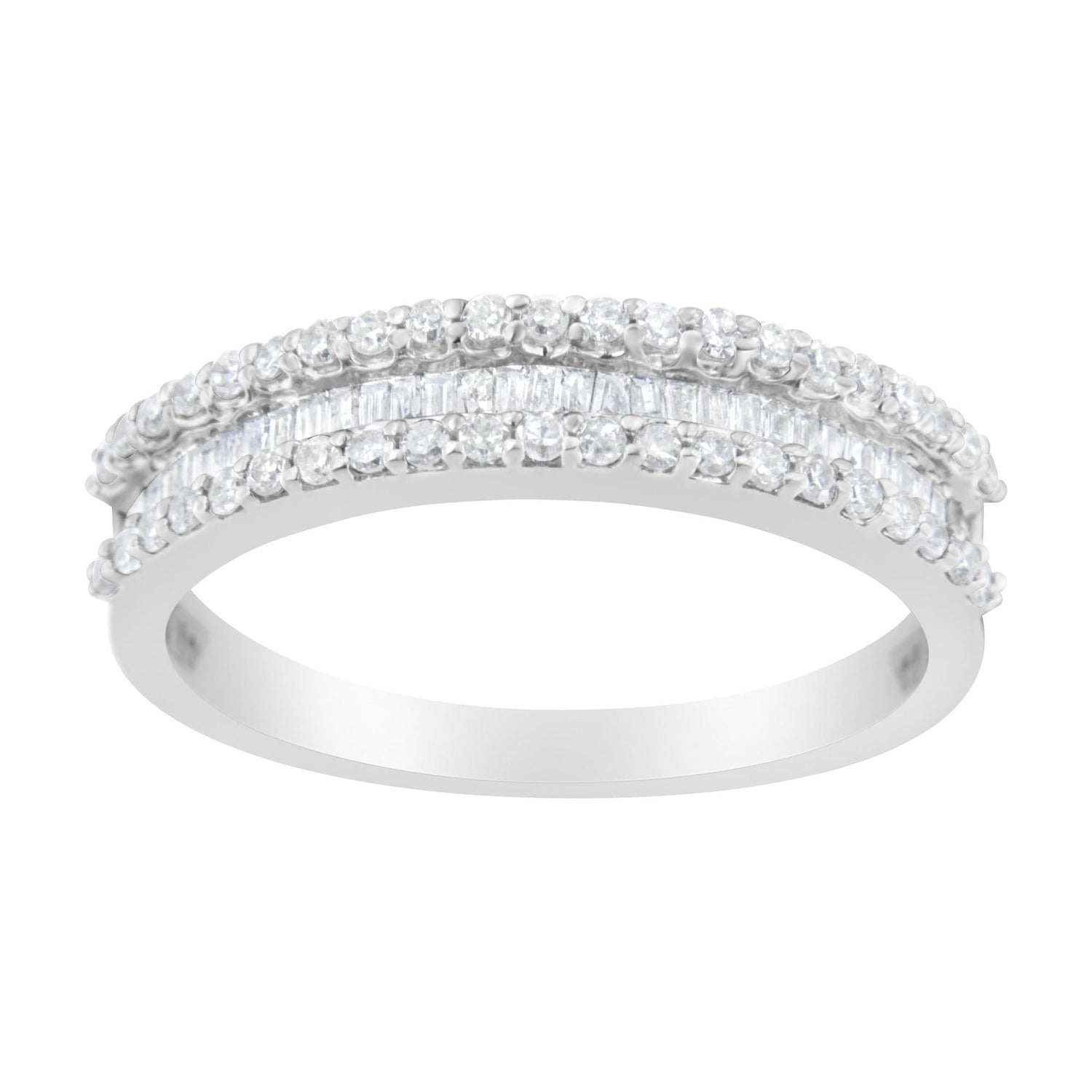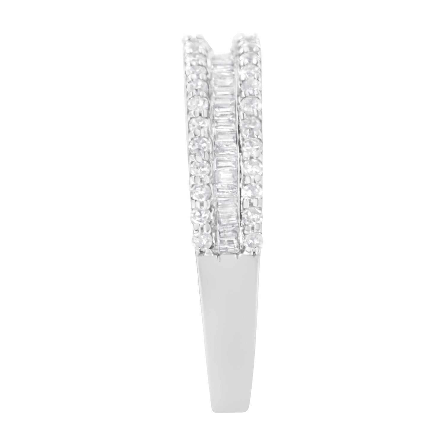 This 14KT White Gold 1/2 CTTW Diamond Modern Band Ring by Haus of Brilliance combines round and baguette-cut diamonds with 14K white gold for a timeless, modern design. The diamonds are set in two rows of round cut diamonds with a row of baguette diamonds in between, giving the band an elegant touch.
