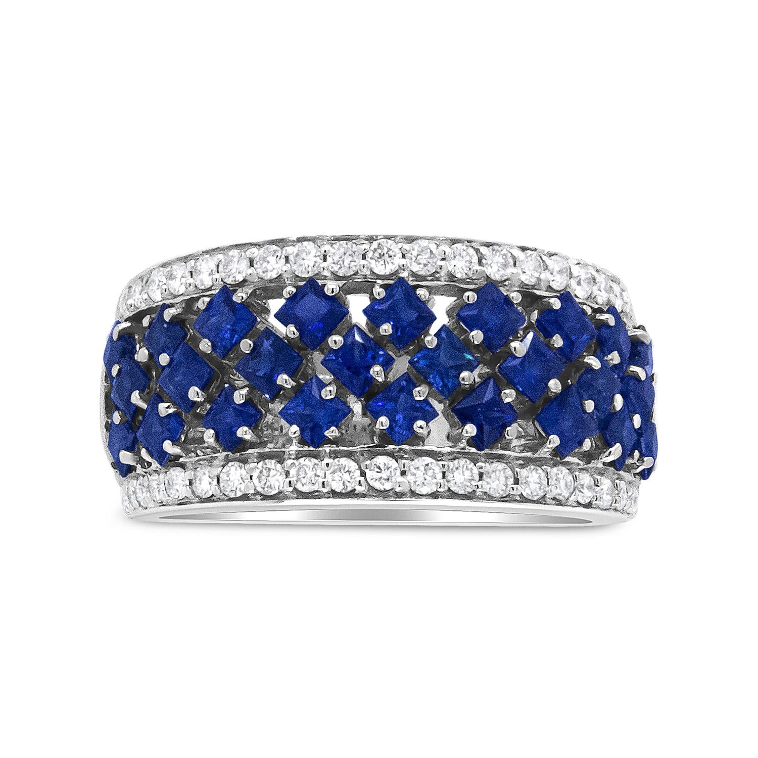 This 18K White Gold 3/8 Cttw Diamond and 2x2mm Princess Cut Blue Sapphire Fashion Band Ring by Haus of Brilliance is a striking and refined fashion ring. Featuring 26 2x2mm princess-cut color-treated blue sapphires and 3/8 Cttw of round diamonds, this ring is crafted in 18K white gold. The diamonds, set above and below the sapphires, add a brilliant shimmer, making this ring a perfect blend of elegance and color.