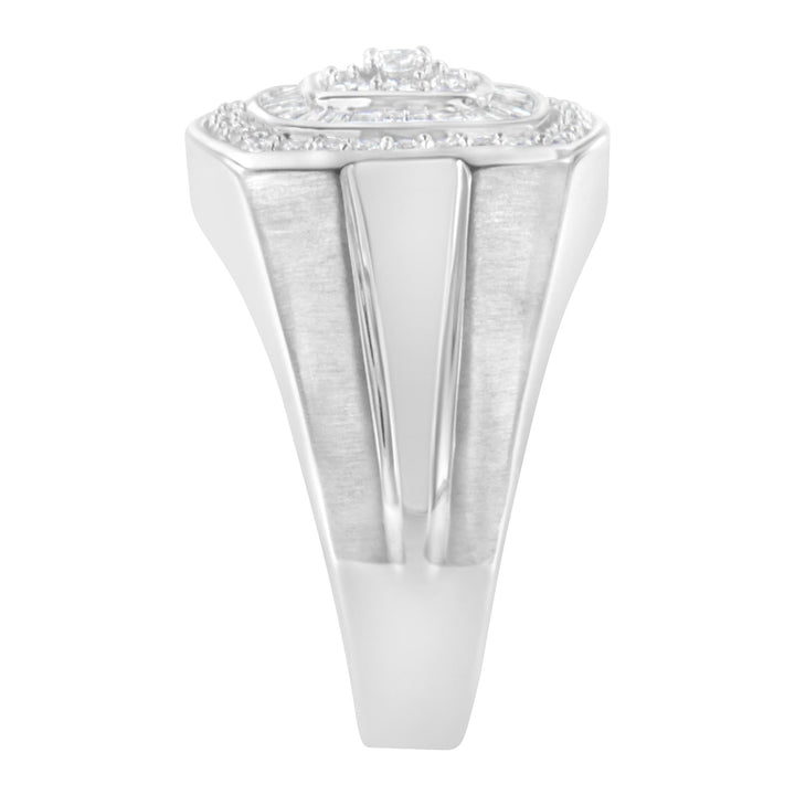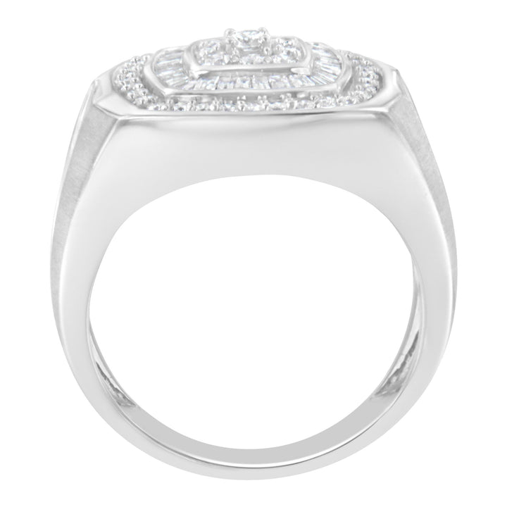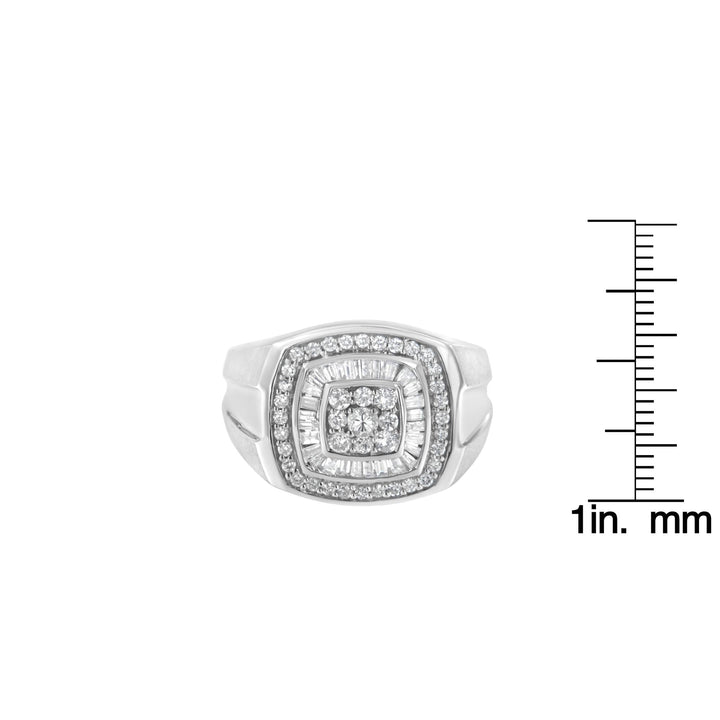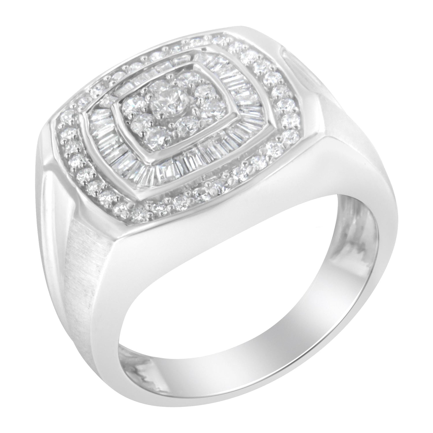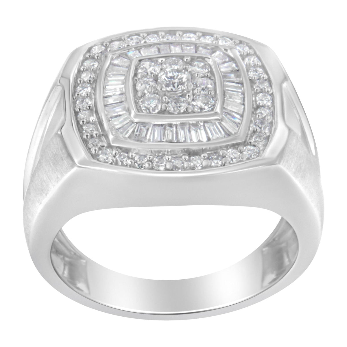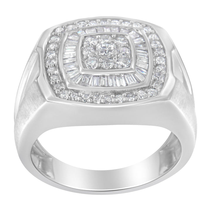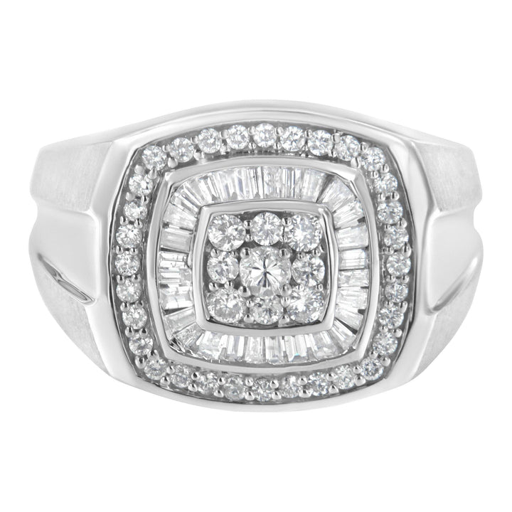 This 14K White Gold Men's 1 Cttw Diamond Band Ring by Haus of Brilliance is a refined fusion of structure and brilliance. At the center of this band, nine round diamonds are prong-set in a square formation, framed first by a halo of baguette-cut diamonds, then encircled by a second ring of round stones. A confident piece for the modern man who values style and substance.