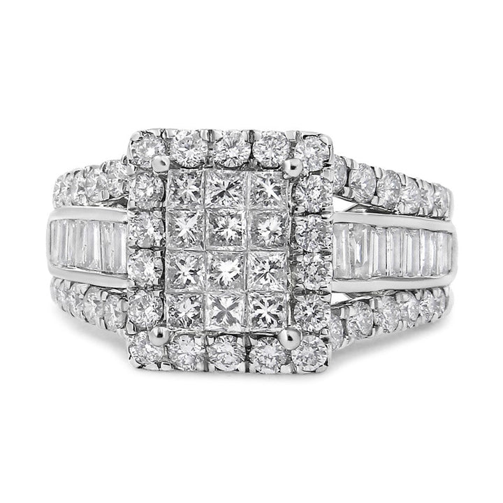 Crafted in 14K white gold, featuring a 2.00 carat total weight of natural princess, round, and baguette-cut diamonds (H-I color, SI1-SI2 clarity).