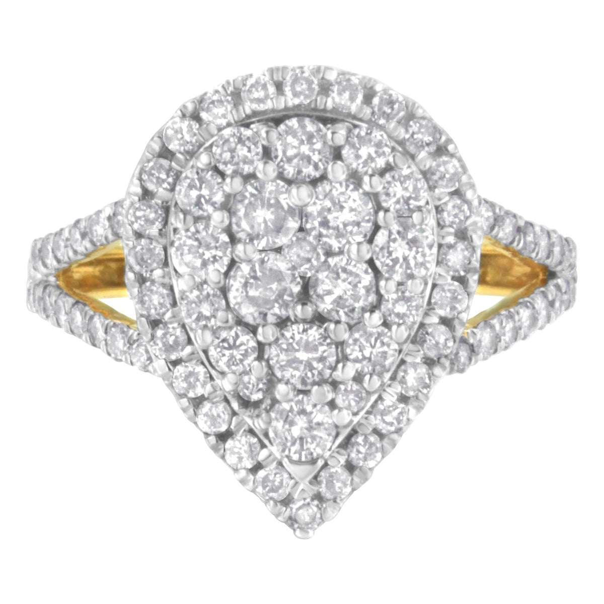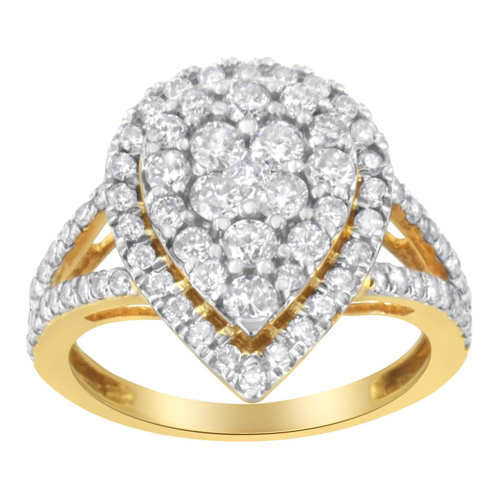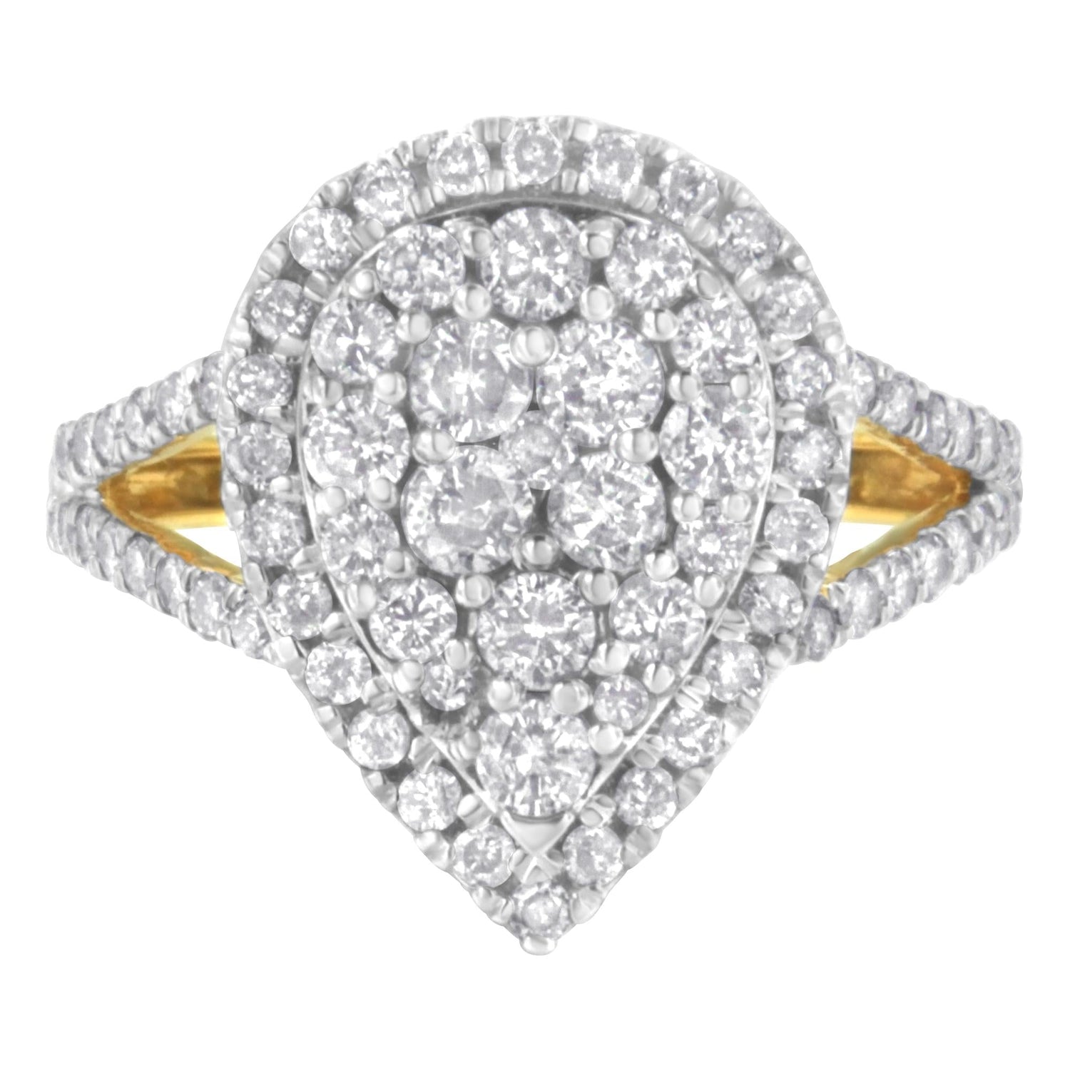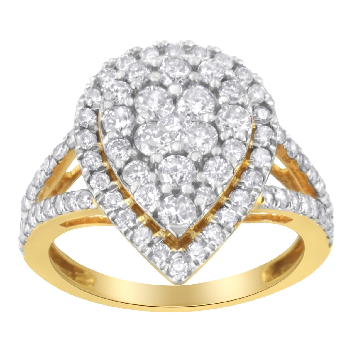 This 2 Micron Yellow Plated Sterling Silver Diamond Cluster Ring by Haus of Brilliance features 80 round-cut diamonds set in a prong setting, arranged in a pear-shaped design. The yellow-plated sterling silver enhances the diamonds' natural brilliance, making this ring a bold statement piece.