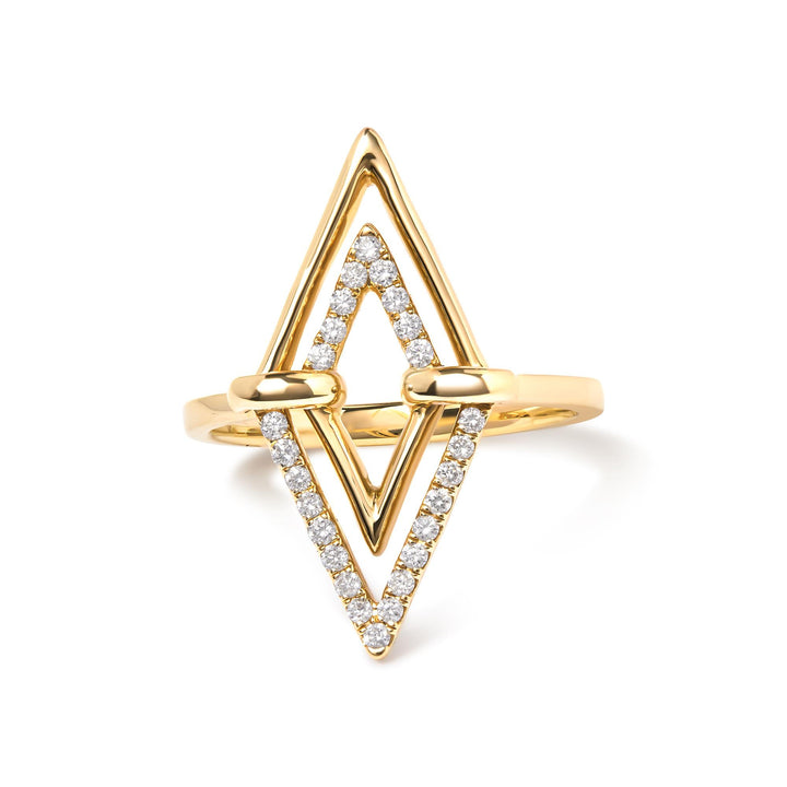 Handcrafted in 14K yellow gold with 1/5 Cttw diamonds (G-H color, SI1-SI2 clarity). Ring features a double triangle design with a polished finish.
