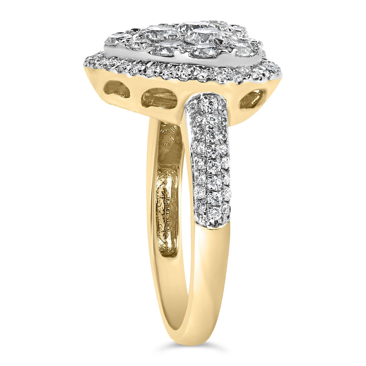 Handcrafted in 14K yellow gold with H-I color, SI2-I1 clarity diamonds, totaling 1.5 carats. Size 7 ring.