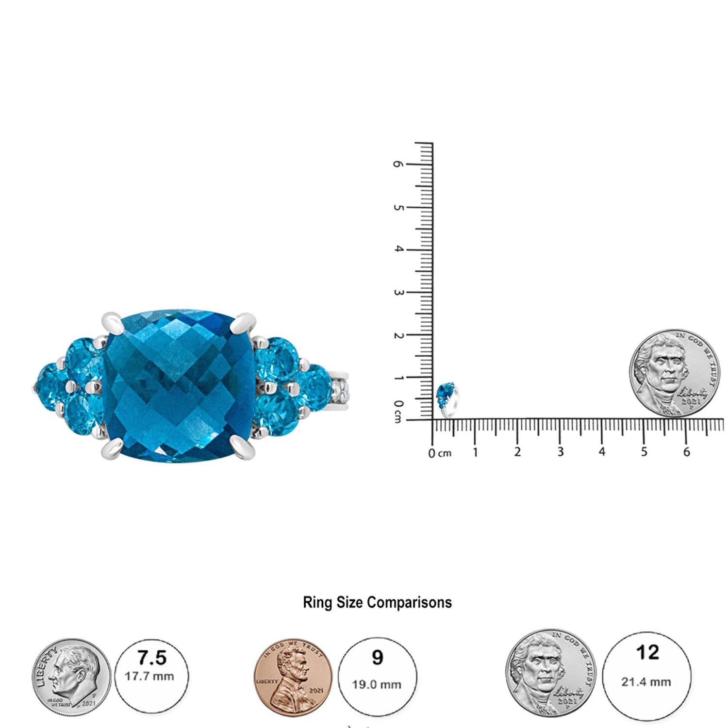 18K White Gold 10mm Cushion Shaped Blue Topaz and 1/6 Cttw Diamond 3 Stone Style Ring (F-G Color, VS1-VS2 Clarity)