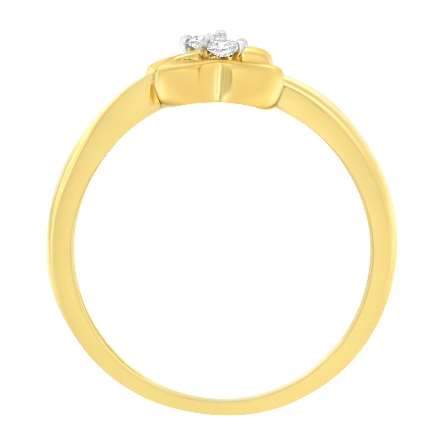 This 14KT Yellow Gold 1/20 CTTW Dual Heart Diamond Ring by Haus of Brilliance features 2 round-cut diamonds set in a prong setting, representing the connection of two hearts. The ring is crafted in 14KT yellow gold, offering a delicate and lovely symbol of love with a total diamond weight of 1/20 carat.