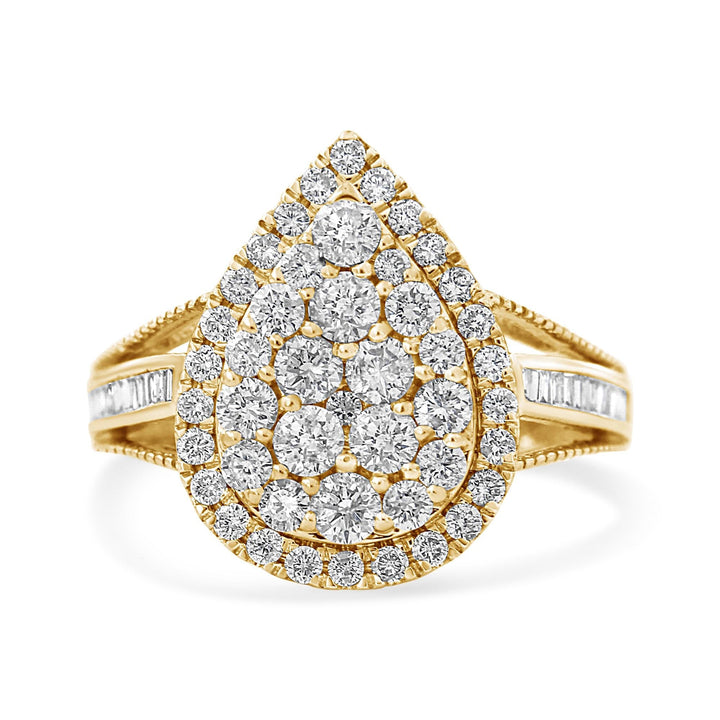 This 10K Yellow Gold Plated .925 Sterling Silver 1 1/2 Cttw Diamond Cocktail Ring by Haus of Brilliance is a stunning expression of sparkle and style. At the center lies a dramatic pear-shaped cluster framed with brilliant round diamonds, while the shank gleams with baguette diamonds in a sleek channel setting. Radiating glamour and grace, this cocktail ring turns any moment into an occasion.