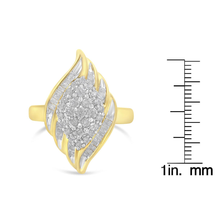 This 10K Yellow Gold Diamond Cocktail Ring by Haus of Brilliance offers a luxurious look with its prong-set round diamonds and channel-set baguette diamonds. The bold design, featuring a total diamond weight of 0.75 ct, makes this ring an exceptional accessory for special occasions, elevating any outfit with a stunning array of sparkling diamonds.
