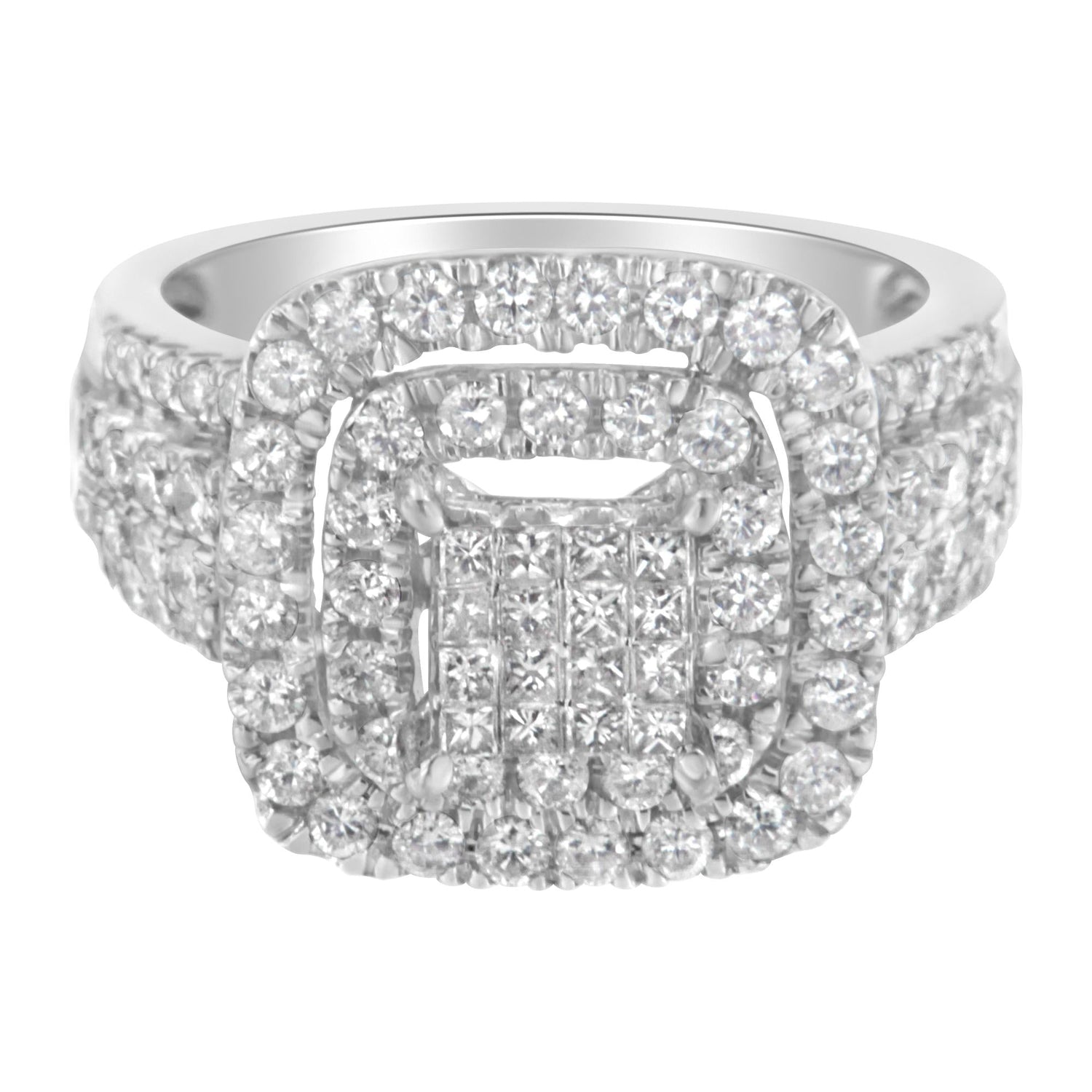 This 14KT White Gold Diamond Cocktail Ring by Haus of Brilliance is a dazzling design with a central square cluster of round diamonds surrounded by a double halo. The wide band features three rows of round diamonds for added sparkle. Crafted in 14KT white gold, this ring has a total diamond weight of 1 1/2 carats.
