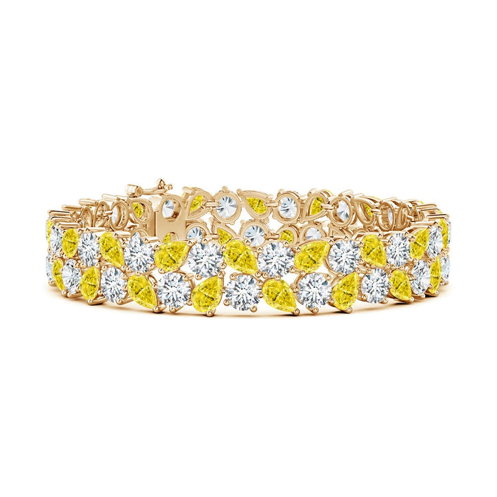 The Aurora Lab-Grown Fancy Intense Yellow and White Diamond Layered Tennis Bracelet by Angara is a true vision of brilliance and artistry. Featuring alternating rows of 36 pear-shaped fancy intense yellow diamonds and 36 round white diamonds, this layered design creates a breathtaking cascade of color and sparkle. A radiant blend of contrast and harmony, this bracelet elevates evening wear and fine jewelry collections alike.