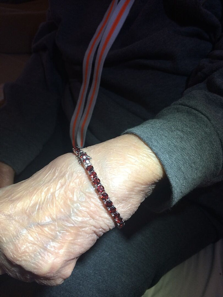 Crafted in sterling silver with 35 round garnets measuring 5 mm each, totaling approximately 21.00 carats. Garnets are AAA quality. Prong setting. Catch clasp.