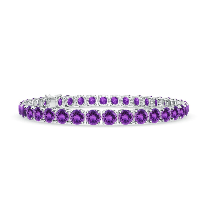 This Classic Amethyst Linear Tennis Bracelet by Angara embodies timeless elegance through vivid color and polished design. Thirty-five round amethysts are set in a sleek line, each stone displaying a rich purple hue that exudes calm strength and creativity. The minimalist silhouette allows the bold beauty of the gemstones to take center stage, secured with a classic catch clasp for enduring sophistication.