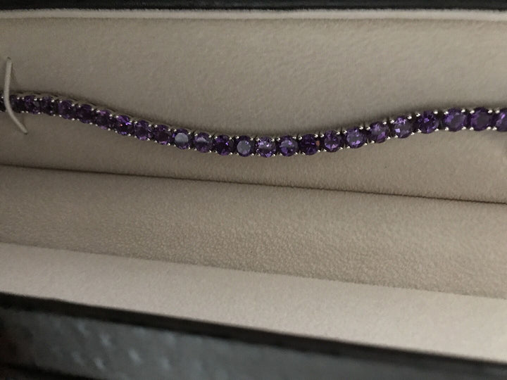 Crafted in sterling silver with 35 round amethysts measuring 5 mm each, totaling approximately 15.75 carats. Heated enhancement. AAA quality. Prong setting. Catch clasp.