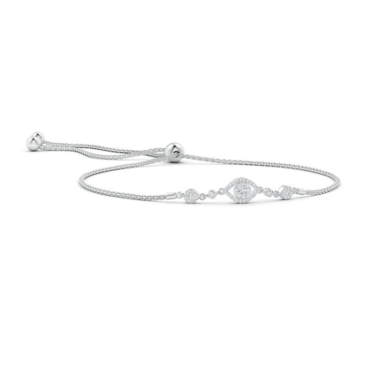 This Diamond Cluster Evil Eye Bolo Bracelet by Angara blends ancient symbolism with modern sparkle. A protective evil eye motif formed by diamond clusters is paired with bezel-set accents, resulting in a refined yet meaningful bracelet.