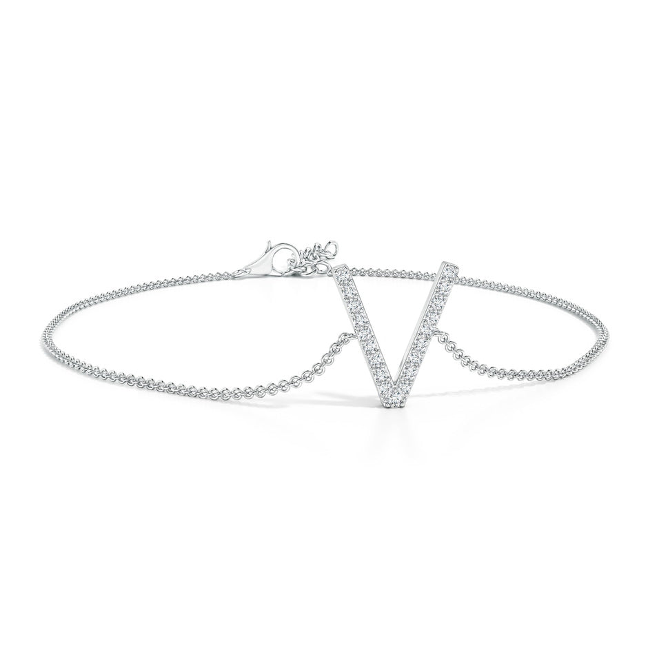 These Prong-Set Diamond Capital 'V' Initial Bracelets by Angara blend elegant craftsmanship with personal flair. The capital 'V' is embellished with 19 prong-set round diamonds, creating a delicate sparkle that enhances everyday luxury. Crafted in 14k white gold, this bracelet is ideal for stacking or wearing alone to showcase identity with subtle sophistication and timeless beauty.