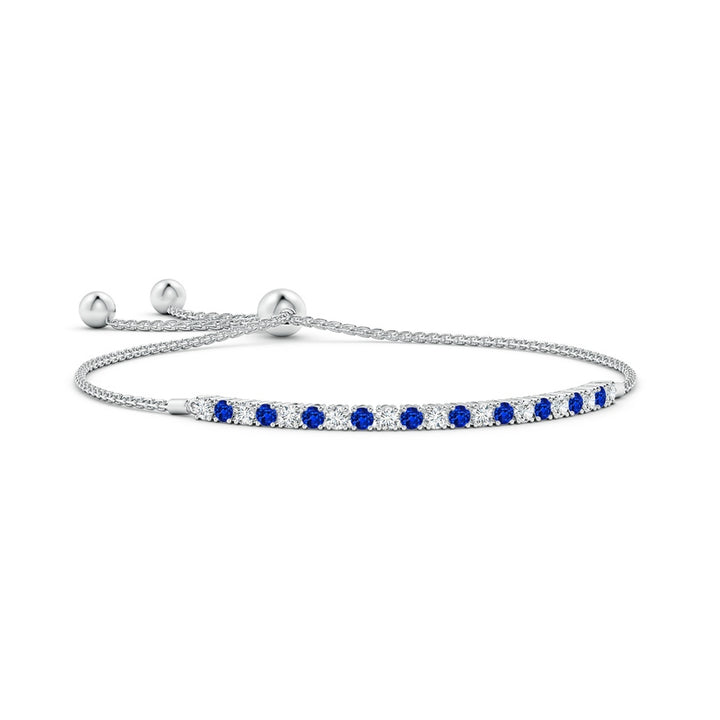 This Prong-Set Round Lab-Grown Blue Sapphire and Diamond Alternating Tennis Bolo Bracelet by Angara balances vibrant color with sparkling brilliance. The adjustable bolo bracelet showcases 10 round lab-grown blue sapphires (2.5mm) alternating with 11 round lab-grown diamonds, all prong set for maximum sparkle. Crafted for those who appreciate heirloom-quality design with modern versatility.