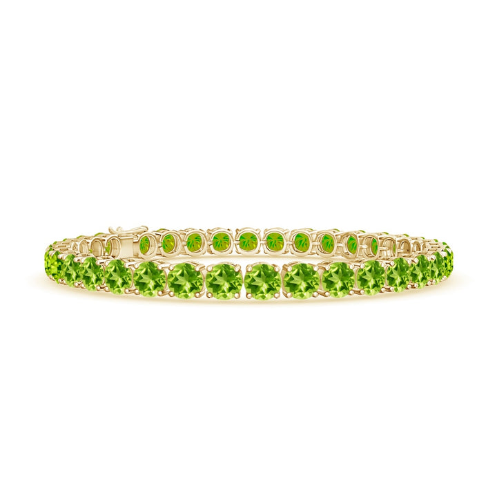 This Classic Peridot Linear Tennis Bracelet by Angara adds an elegant touch of nature’s vibrancy. The 14k yellow gold bracelet showcases 35 prong-set round peridots, whose earthy green hues symbolize growth and healing. Designed as a timeless eternity piece, it secures with a catch clasp, making it ideal for stacking or as a standalone statement of luxury and life.