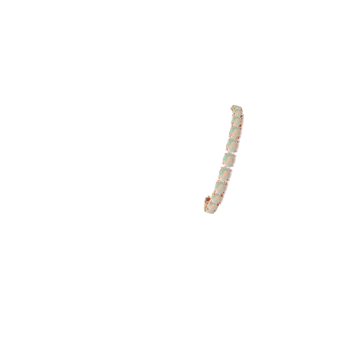 Crafted in 14k rose gold with 24 prong-set oval opals approximately 7x5mm each, totaling 10.80 carats. Opals are AAAA quality grade with no enhancements. Bracelet secures with a lobster claw clasp.