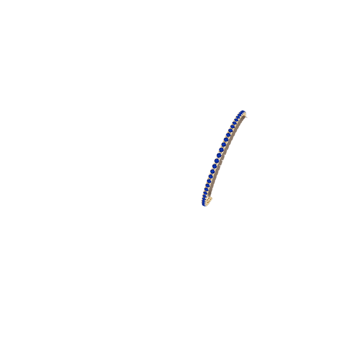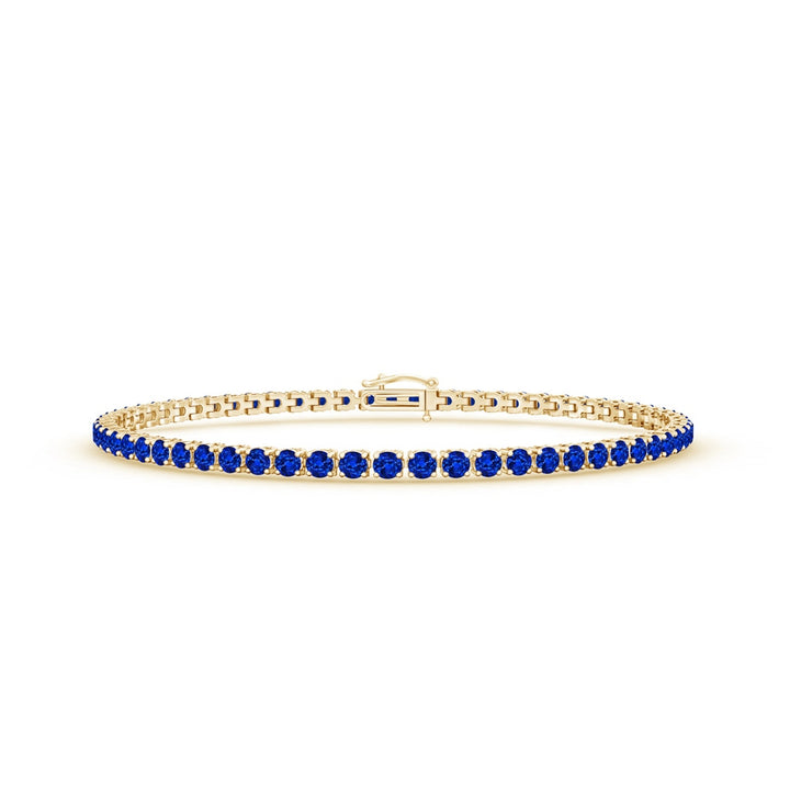 This Prong-Set Round Blue Sapphire Eternity Tennis Bracelet by Angara features prong-set round blue sapphires in a continuous line, expertly crafted in 14k yellow gold. The bracelet secures with a catch clasp, offering vibrant color and timeless elegance.