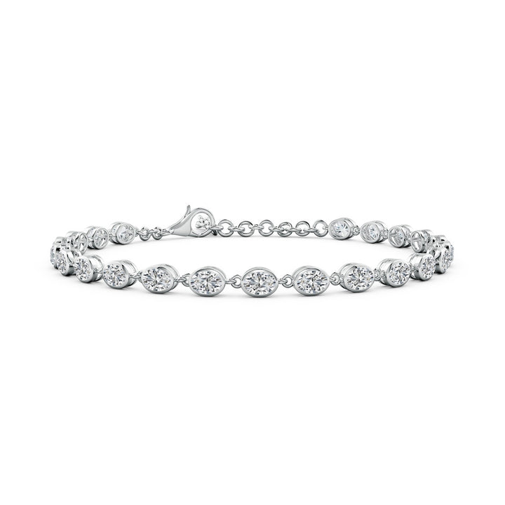 These Bezel-Set Oval Diamond Tennis Bracelet by Angara capture timeless sophistication with oval diamonds encased in sleek bezel settings along a 14k white gold chain. The bracelet closes with a secure lobster claw clasp, making it an elegant staple that transitions effortlessly from day to night. Perfect for layering or wearing solo, this piece symbolizes endless grace.