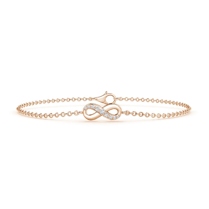 This Prong-Set Diamond Infinity Chain Bracelet by Angara features a delicate 14k rose gold infinity knot adorned with nine prong-set round diamonds. The elegant design is secured with a lobster claw clasp, perfect for everyday luxury and layering.