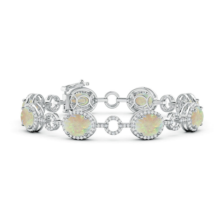 This Oval Opal Halo Open Circle Link Bracelet by Angara enchants with eight kaleidoscopic AAA-grade oval opals framed by dazzling diamond halos. Connected by open circle links crafted in 14k white gold, this bracelet beautifully blends color and sparkle. The 96 prong-set diamonds enhance the opals’ natural fire, creating a luminous piece perfect for heirloom-worthy elegance and versatile styling.