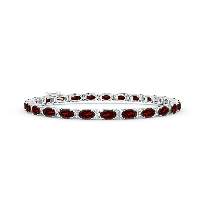 The Classic Oval Garnet and Diamond Tennis Bracelet by Angara exudes luxury with its continuous row of vibrant oval garnets and sparkling diamonds. Crafted in 14k white gold, this bracelet combines rich red hues with brilliant sparkle in a timeless tennis bracelet design, perfect for elevating any ensemble.