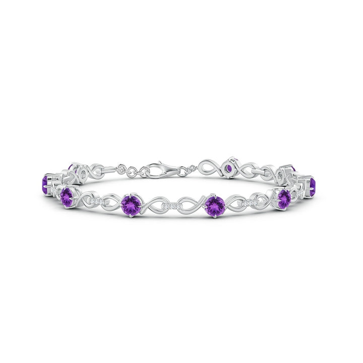 This Amethyst and Diamond Infinity Link Bracelet by Angara enchants with deep purple round amethysts spaced along a 14k white gold infinity chain. Sparkling diamond bar links between the amethysts amplify the piece’s allure, symbolizing timeless beauty and strength with contemporary sophistication.