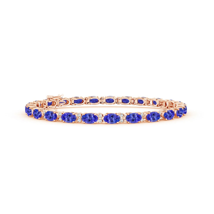 This Classic Oval Tanzanite and Diamond Tennis Bracelet by Angara dazzles in 14k rose gold. The bracelet features a continuous row of oval bluish-purple tanzanites and sparkling round diamonds in prong settings, creating a luxurious and vibrant tennis-style display.
