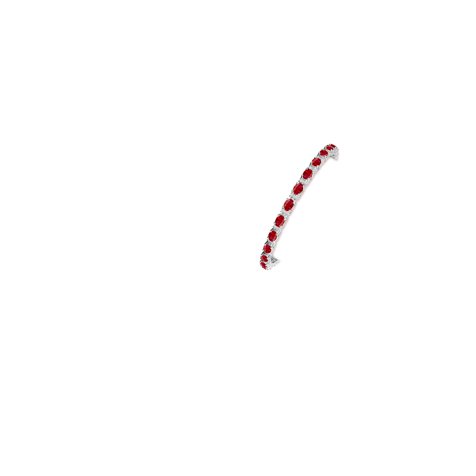 Crafted in 14k white gold with 28 oval AAA heated rubies (5.60 ct total, 4x3mm each) and 56 round H SI2 diamonds (0.45 ct). Prong settings.
