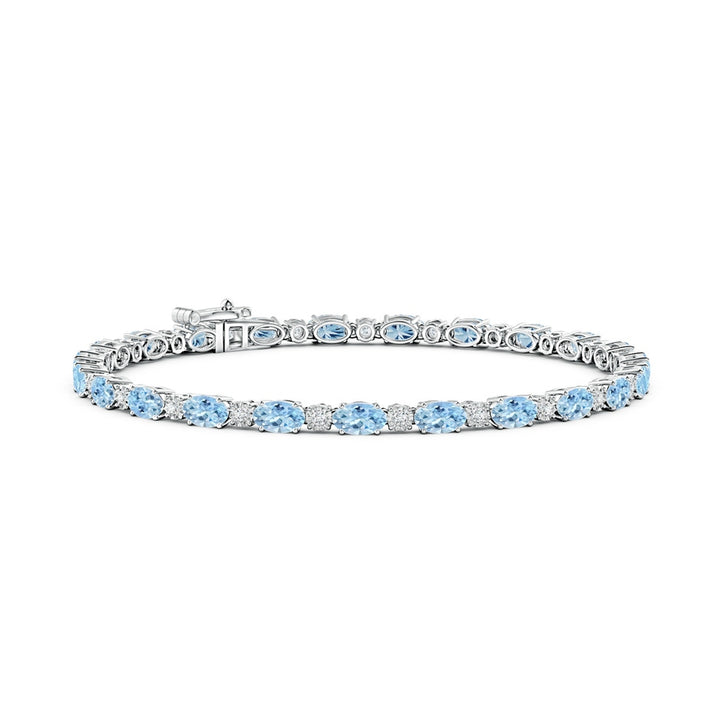 This Oval Aquamarine Tennis Bracelet with Gypsy Diamonds by Angara combines oceanic-blue oval aquamarines with sparkly gypsy-set illusion diamonds on a 14k white gold tennis bracelet. The luxurious alternating pattern creates an eye-catching, elegant look.