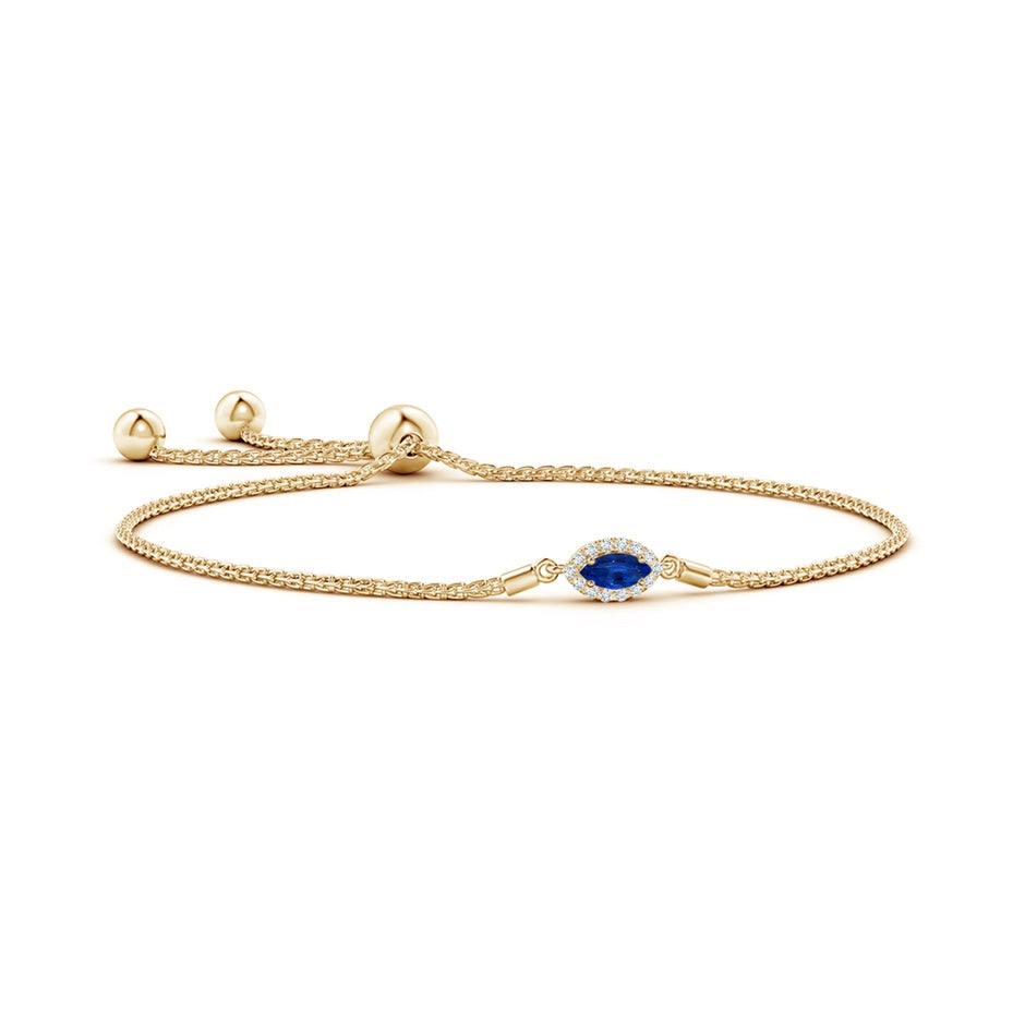 This East-West Marquise Sapphire Bolo Bracelet by Angara highlights a prong-set marquise sapphire laid horizontally for modern appeal. Encircled by a glittering halo of pavé diamonds, this adjustable 14k yellow gold bracelet blends timeless elegance with contemporary style.