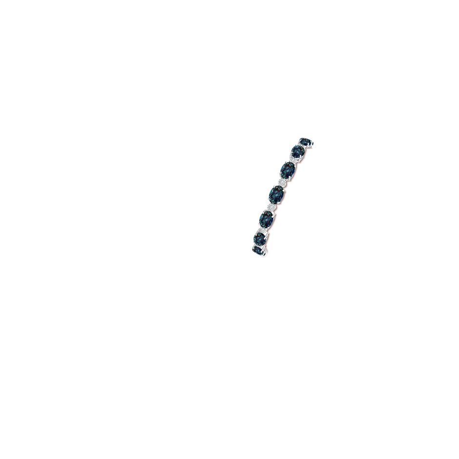 Crafted in 14k white gold. Features 18 oval lab-grown alexandrites approx. 7x5 mm each (18.00 cts total), prong set. Accented with 18 round lab-grown diamonds totaling 0.38 ct (F-G VS grade), gypsy set.