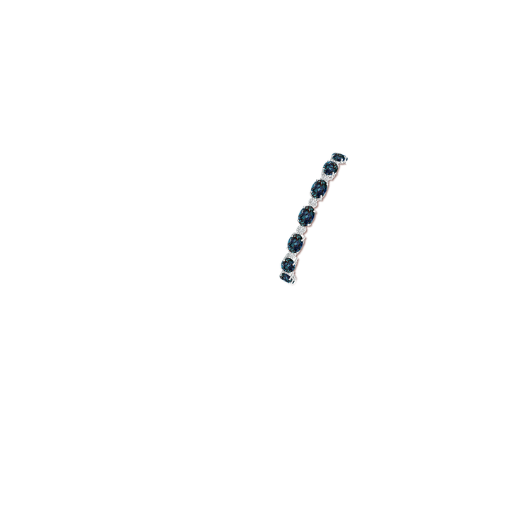 This Oval Lab-Grown Alexandrite Stackable Bracelet with Illusion Diamonds by Angara blends color and sparkle in a delicate design. Oval lab-grown alexandrites alternate with gypsy-set round illusion lab-grown diamonds along a 14k white gold chain with catch clasp. This bracelet adds a dash of ethereal charm and versatility, ideal for stacking or solo wear.