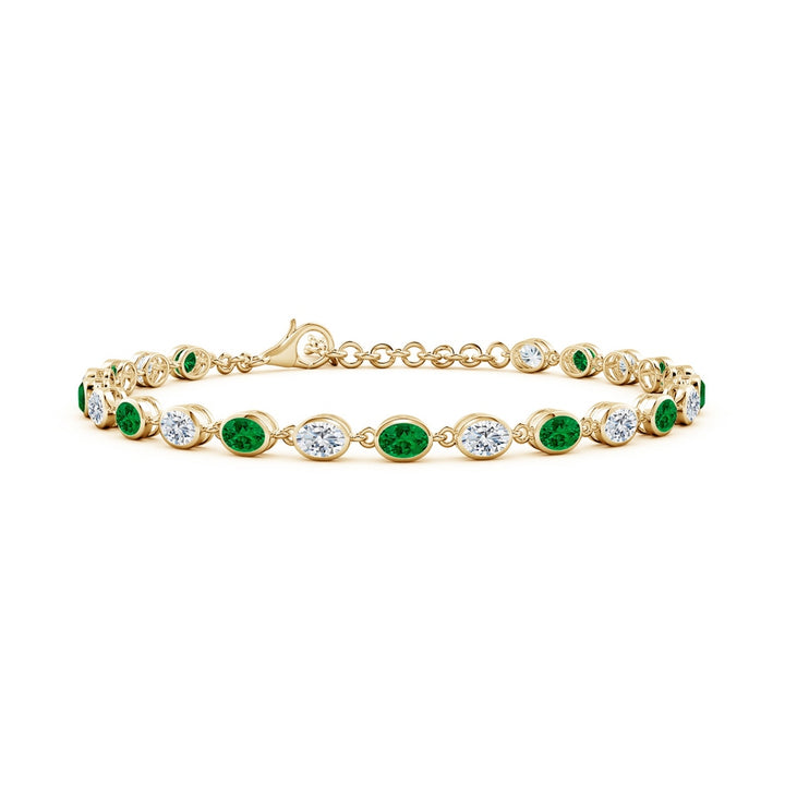 This Bezel-Set Oval Lab-Grown Emerald and Diamond Tennis Bracelet by Angara showcases timeless luxury in an 18k yellow gold setting. Alternating bezel-set oval lab-grown emeralds and lab-grown diamonds create a vibrant, continuous line of sparkle and color, secured with a lobster claw clasp for comfort and security. A perfect piece to elevate any ensemble with graceful sophistication.
