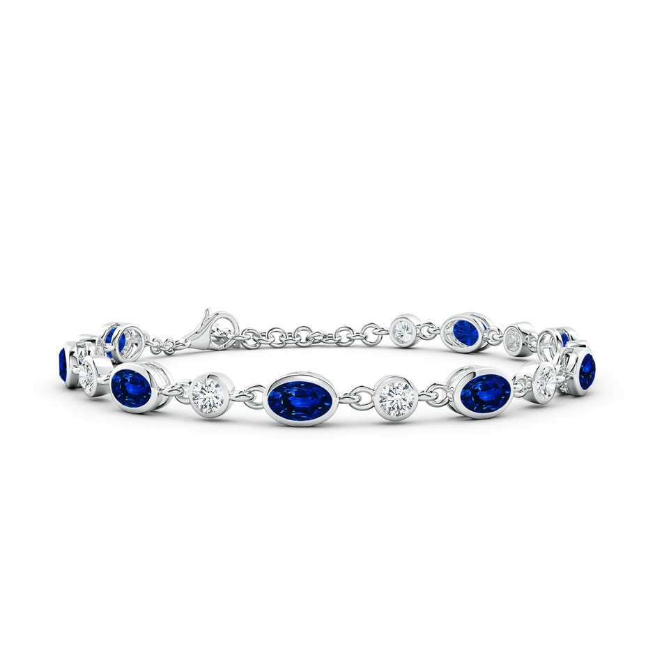 Crafted in 18k white gold with eight oval lab-grown blue sapphires (6x4mm, 4.80 ct. tw.) and eight round lab-grown diamonds totaling 1.27 ct. tw., F-G VS quality, bezel set. Lobster claw clasp closure.