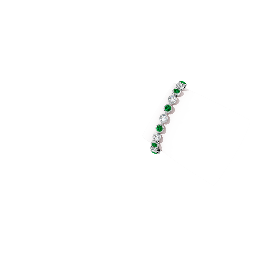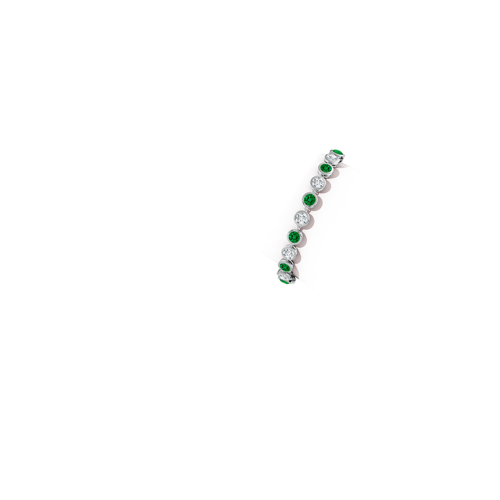 Made in 14k white gold featuring six round lab-grown emeralds (5mm, 2.70 ct. tw.) and six round lab-grown diamonds totaling 2.82 ct., F-G VS quality, bezel set. Lobster claw clasp.