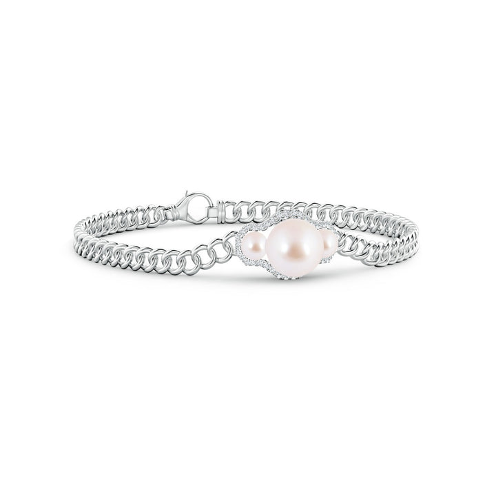 Three Stone Japanese Akoya Pearl Bracelet with Diamond Halo