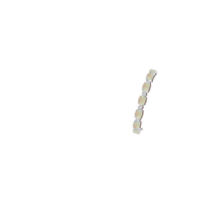 Crafted in 14k white gold featuring eighteen 7x5mm AAA-grade oval opals prong set (8.10 ct total). Accented with eighteen gypsy-set round diamonds totaling 0.38 ct, H color, SI2 clarity.