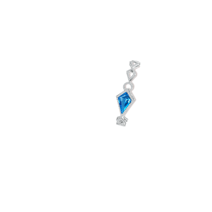 Crafted in platinum with a 10.21 carat kite-shaped step-cut Swiss blue topaz (approx. 22.19x13.94x7.07mm), prong set. Accented with 131 round white diamonds totaling 1.76 carats, H SI2 quality, prong set. Features intricate scrollwork details.