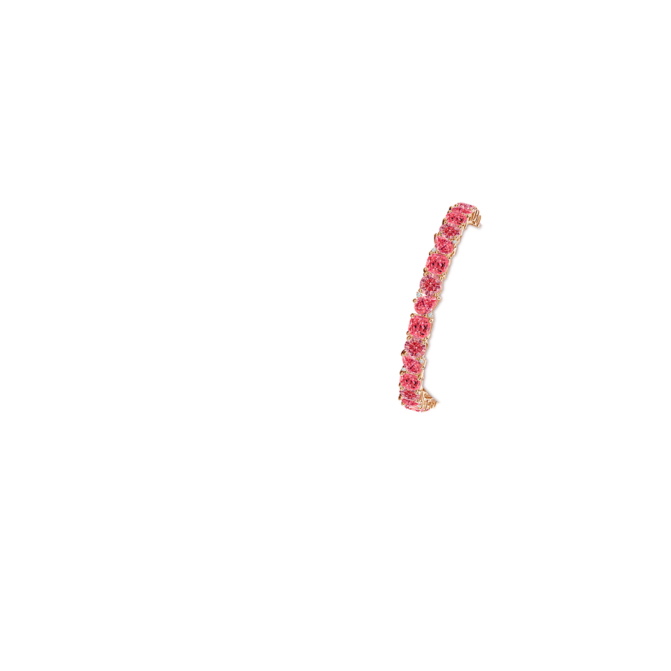 Crafted in 18k rose gold with 10 cushion lab-grown pink diamonds totaling 12.00 ct and 10 pear lab-grown pink diamonds totaling 7.10 ct, all prong set. Fancy intense color, VS clarity.