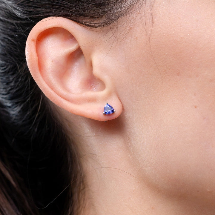 These Martini-Set Trillion Tanzanite Stud Earrings by Angara showcase exquisite violet-blue tanzanites in sleek martini prong settings. Crafted in 14k white gold, each 6mm trillion cut tanzanite (heated, AAAA grade) captures light with brilliant fire, perfect for adding vibrant color and elegance to any look.