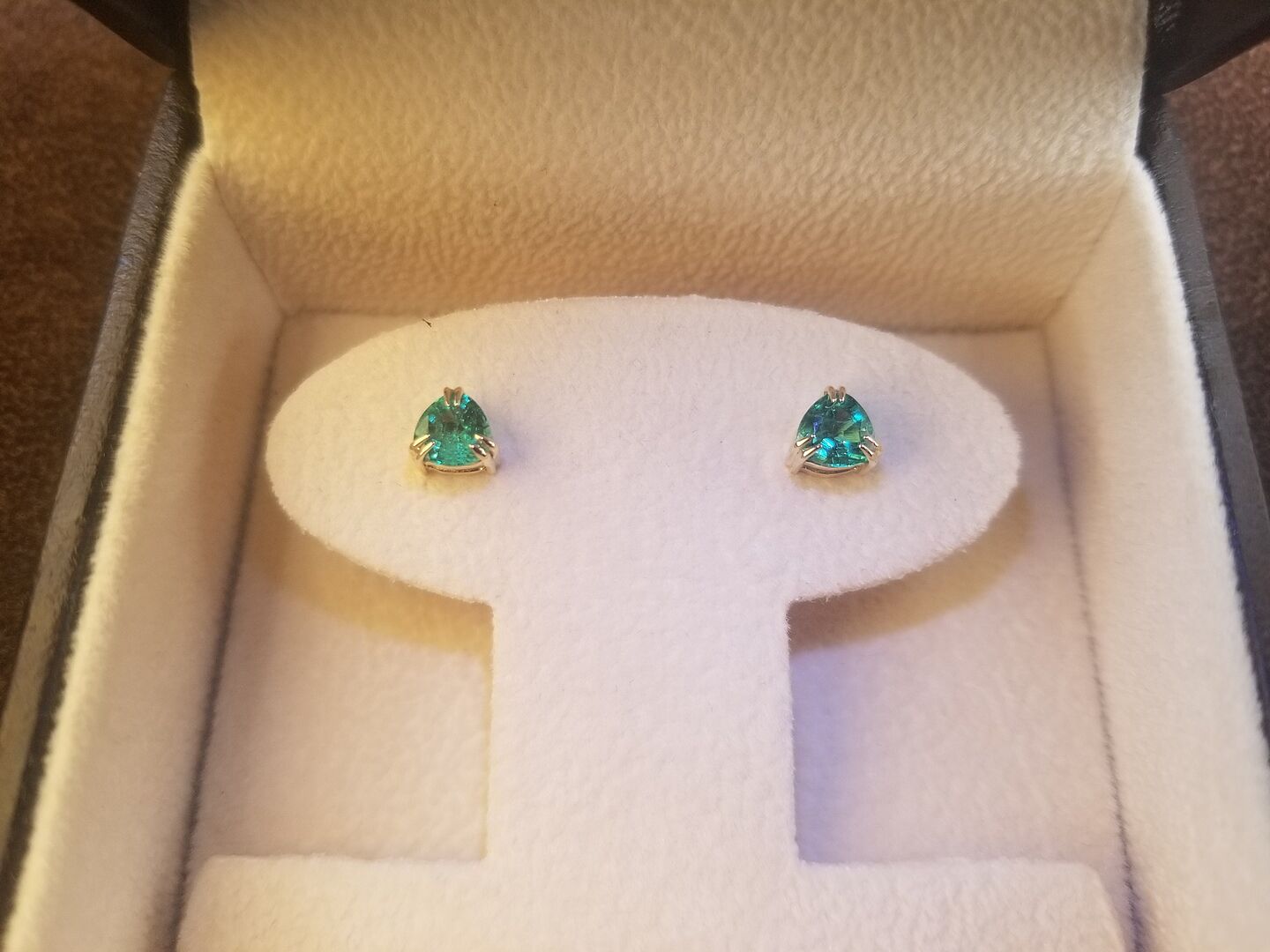 Crafted in 14K yellow gold, featuring 2 trillion AAAA-grade emeralds approximately 4mm each, totaling 0.44 cts, set in claw prong settings with oiling enhancement.