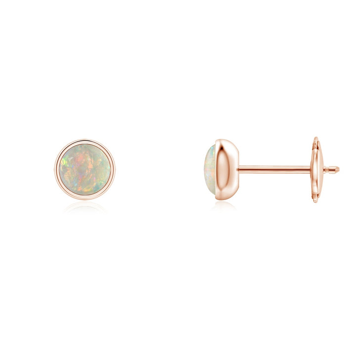 These Bezel Set Opal Solitaire Stud Earrings by Angara are modern and minimalistic. The 14k rose gold earrings showcase round cabochon opals secured in bezel settings, captivating with their play of colors and understated elegance.