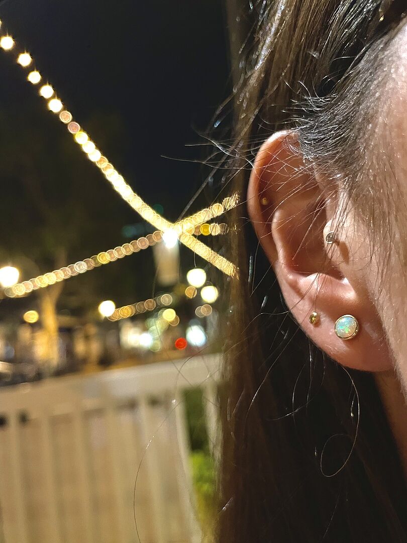 Crafted in 14k rose gold with two round opals approximately 4mm each, total carat weight 0.32 carats, AAAA quality, bezel setting. Also available in white, yellow, and platinum.