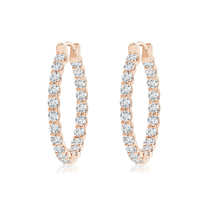 These Prong-Set Round Lab-Grown Diamond Inside Out Hoop Earrings by Angara are a stunning display of brilliance. Featuring forty-two lab-grown diamonds adorning both the inside and outside of polished 14k rose gold hoops, they offer a spectacular sparkle from every angle.