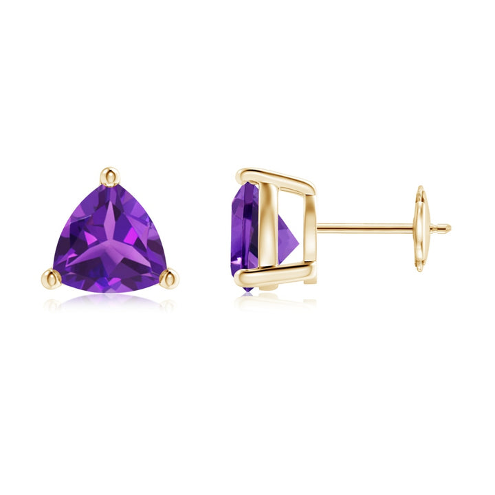 These Basket-Set Trillion Amethyst Stud Earrings by Angara display regal beauty with striking trillion-cut royal purple amethysts. Set in classic prong settings and mounted in 14k yellow gold, these solitaire studs radiate sophistication and vibrant color, making them a standout accessory.